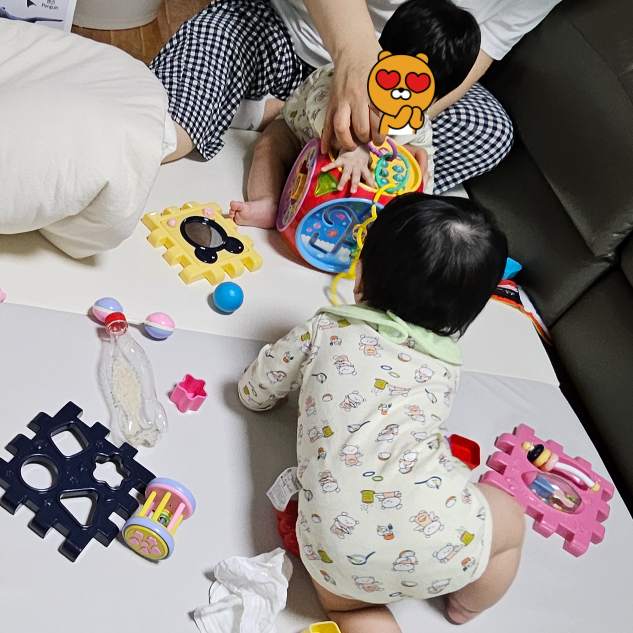 특히 아가 중 한 명만 이른바 ‘엄마껌딱지’였는데, 어느새 둘 다 엄마를 찾으며 서로 안아 달라고 조르기 시작했습니다. 그야말로 예전보다 엄마를 더 찾는 느낌이 강해졌고, 그 변화는 하루 이틀이 아니라 계속 이어졌습니다.